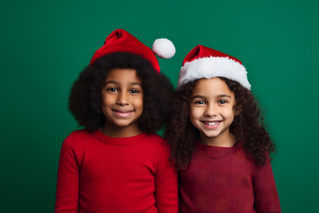 A group of five smiling children wearing colorful Christmas sweaters and Santa hats against a dark green background.