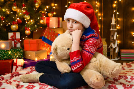 Child girl posing in new year or christmas decoration. Festive lights and lots of gifts, an elegant Christmas tree with toys. The girl is wearing a red sweater and a Santa hat, she knits