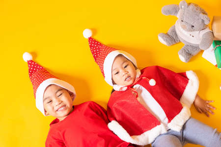 Asian little cute child boy and girl smile, Top view of two brethren kid dressed in red Santa Claus hat the concept of holiday Christmas Xmas day or Happy new year, isolated lying on yellow background