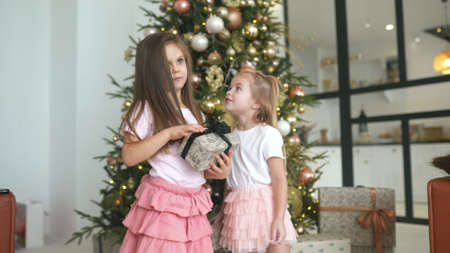 Merry Christmas and Happy Holidays! Cute little children girls with present gift box near tree at home