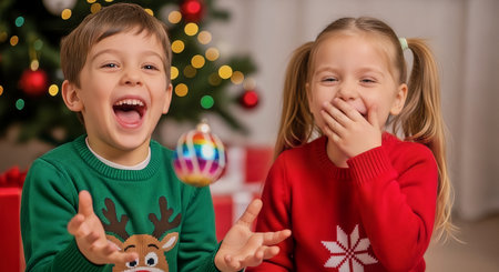 A pair of laughing children in red and green holiday sweaters play with a colorful ornament in a warmly lit living room decorated for Christmas. Candid, high quality festive moment.