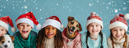 Multiracial children with dog wearing Santa hats smiling and enjoying snowfall. Concept of Christmas celebration, holiday season, multicultural kids, festive cheer, Multicultural Unity. Copy space. Banner.