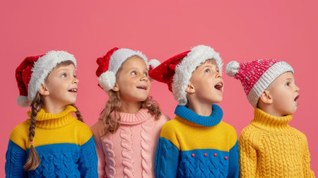 Group of happy children wearing Santa hats and festive sweaters against a vibrant pink background.