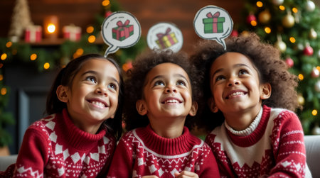Three happy children wearing matching festive sweaters sit together, gazing upward with excitement as they share their holiday wishes for gifts in a warm, decorated living room.