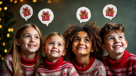 Four children wearing matching sweaters share excited expressions while imagining presents. The background features twinkling holiday lights and a cheerful atmosphere.