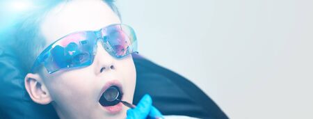 The boy with goggles in the dental chair. The doctor examines the oral cavity with a special dental mirror