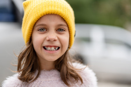 Smiling girl with bright blue eyes wearing yellow knit beanie and light pink sweater. Girl shows teeth in joyful expression. Blurred vehicles visible in background. Close-up portrait outdoors