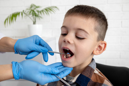 A boy is being examined by a dentist. There are cavities on his teeth