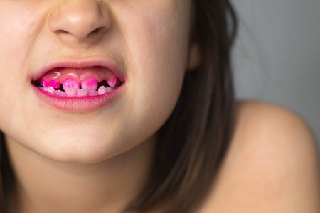Close-up of a child's mouth with pink dental disclosing solution highlighting areas of plaque, showing dental hygiene practices and the importance of brushing