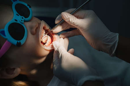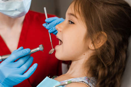 Caucasian young child girl sitting in medical chair while dentist fixing teeth at dental clinic using dental tools instruments, close-up photo of face. professional medical specialist.