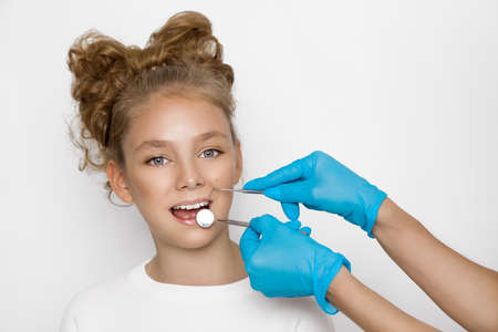 examination of the mouth of a little girl. regular visits to dentist