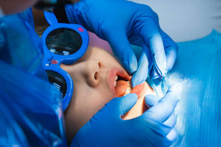 Close up of dentist's hands with assistant in blue gloves are treating teeth to a child, patient's face is closed.