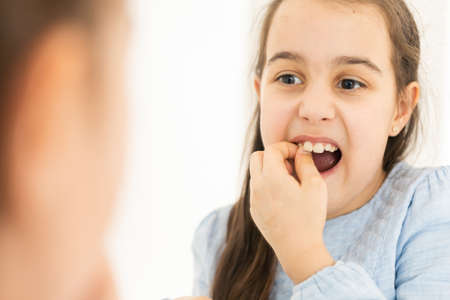 Selective Focus Child's teeth. An 8 year old little girl lost a baby incisor. Children's dentistry and oral hygiene concept. Macro shoot