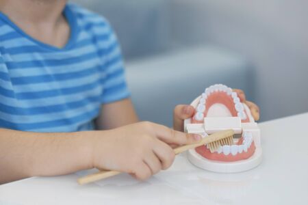 Close-up model of a human jaw with white teeth. little boy learns to brush his teeth with dental jaw layout.