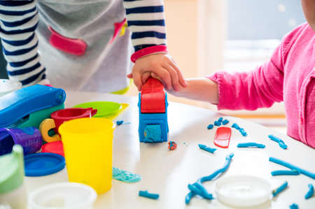 Kids playing with play dough on the table