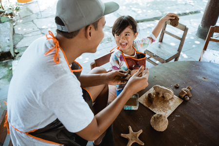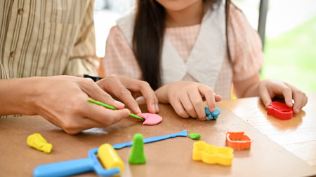 Adorable little girl and father playing with colorful plasticine. Handmade skills training