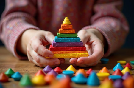AI Generative Child assembling toy pyramid in playroom, toy colorful mosaic