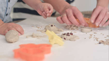 Child make figures from modeling clay. Creative activities in the process. Christmas and New Year handmade decor.