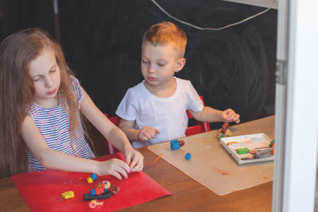 A girl of seven years and a boy of three years sit at the table and sculpt. Front view. Brother and sister. The interior of the childrens room. Chalkboard on background.
