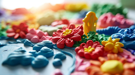 A lively assortment of colorful clay shapes lies on a bright background, inspiring imaginative play and artistic creation in a cheerful atmosphere.