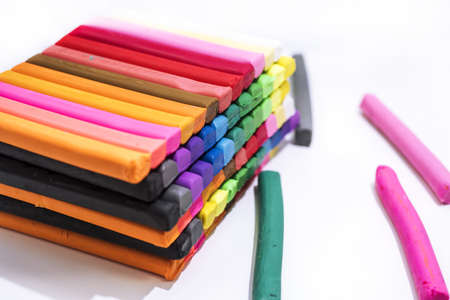 Multi-colored plasticine sticks with sculptural knife, kids hands background