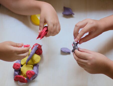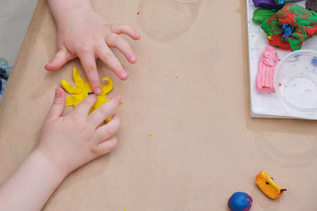 children's hands play with plasticine