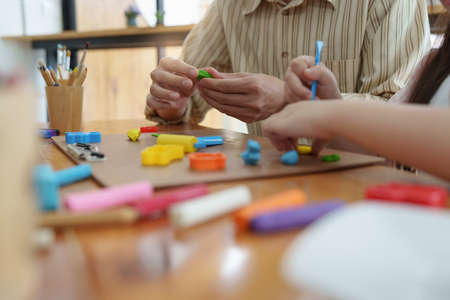 cropped and close-up, Happy and kind male art teacher teaching and showing how to moulding colorful clay in a different shapes.