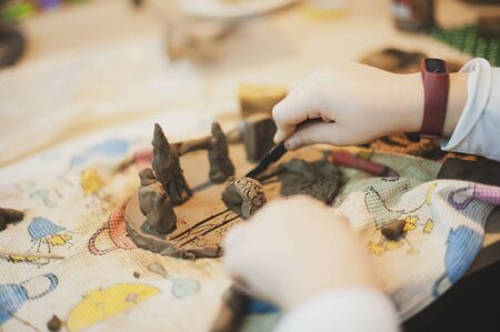 the child's hands sculpt houses made of red clay in the club of additional education