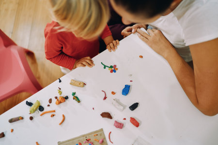 kindergarten teacher molding plasticine with disabled child