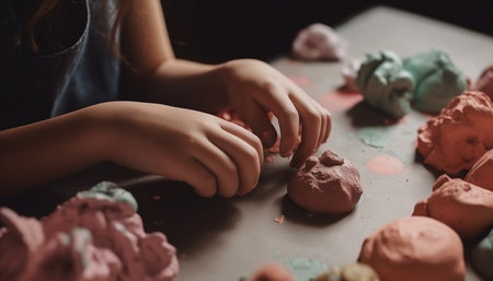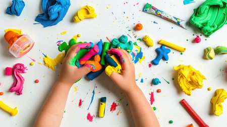 Child hands shaping vibrant clay, playful creative activity with plasticine on white