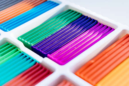 large box with multi-colored plasticine. stationery store for schoolchildren.