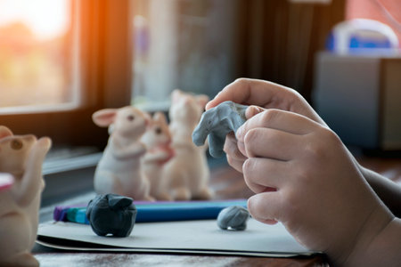 The hands of a little boy sculpt a funny white rabbit from plasticine. Children's creativity.