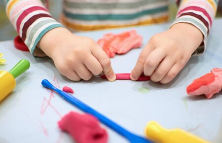 Close up of child's hands playing with plasticine at home.
