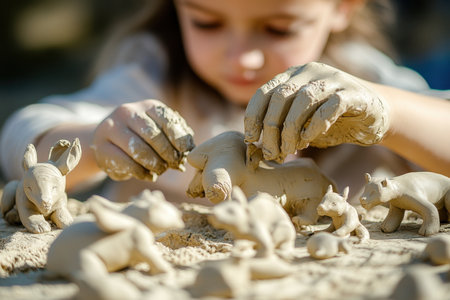 A child focuses on shaping animal figures from clay while playing outside on a sunny afternoon.