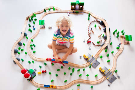 Kids play with toy train railway. Child playing with wooden trains. Toys for little boy. Preschooler building rail road and blocks at home or daycare, preschool. Kindergarten educational games.