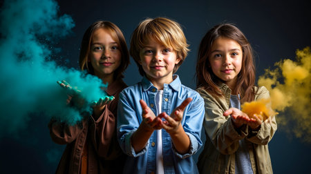 Portrait of three children, studio shoot. Concept of diversity in friendship.