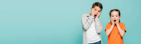 shocked kids touching cheeks and looking at camera isolated on blue, banner