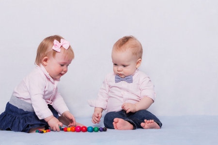 Cute infant babies playing with colorful beads
