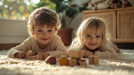 Full length portrait of cute boy playing with girl with down syndrome while sitting on floor and building blocks together in home interior, copy space