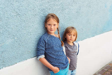 Two kids, girl and little boy, posing outdoors, standing against blue wall