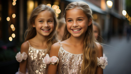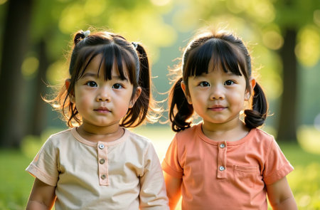 AI Generative Portrait of two little girls walking in the park, happy childhood