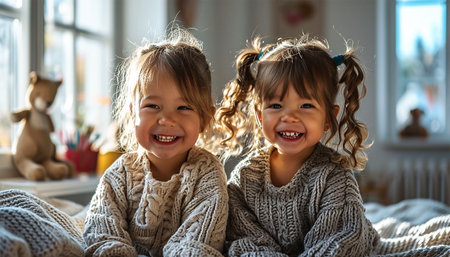 Two cheerful twin girls with vibrant, curly hair express pure joy while jumping on a cozy bed. Their playful energy fills the bright room, creating a delightful atmosphere of childhood happiness.
