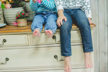portrait of two adorable siblings brother and sister laughing together, Portrait of cute kids in casual wear posing looking at camera family