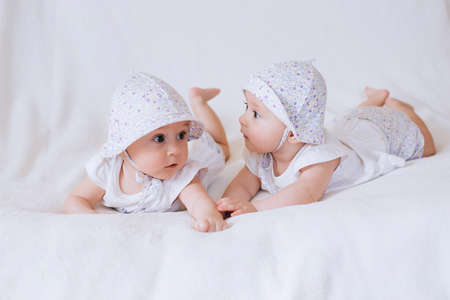 Happy twins in funny hats. Children girls 7 months.