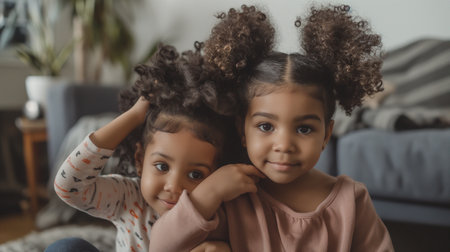 african american little girls looking at camera while sitting on sofa at home