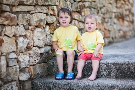 Two little child, girl and boy in nature, sitting on stone steps looks aside, outdoors. Space for Text. Retro toned. Summer autumn.