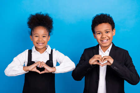 Photo of small little afro american children wear formalwear uniform fingers heart shape smile people isolated on blue color background
