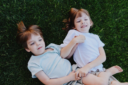 Enchanting children with playful expressions lying on green grass, showcasing innocence and joy. This image captures a moment of carefree childhood bliss.
