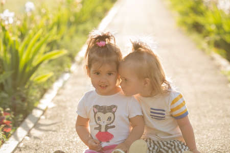 Portrait of two little sisters outdoors at summer