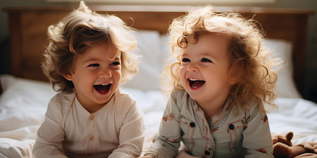Two cute kids laughing and playing on the bed, close-up. High quality photo. Generative AI